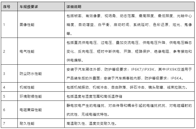 圖表4. 車載攝像頭車規(guī)級(jí)要求(信息來源:《QCT/T 1128 汽車用攝像頭》、公開資料整理)