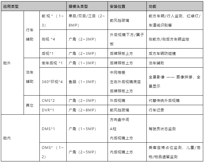 車載攝像頭的應(yīng)用場(chǎng)景可分兩大類:艙外應(yīng)用和艙內(nèi)應(yīng)用。艙外應(yīng)用包括泊車輔助、行車輔助、CMS、DVR等應(yīng)用;艙內(nèi)應(yīng)用包括DMS、OMS等應(yīng)用。