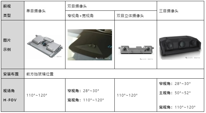 其中,單目攝像頭主要應(yīng)用于中低端車型,多采用前視一體機(jī)形式。雙目攝像頭又可細(xì)分成兩類:雙目立體攝像頭和兩個(gè)單目攝像頭(窄視角+寬視角)組合。三目攝像頭基本沒有一體機(jī)的形態(tài),一般是由三個(gè)不同視場(chǎng)角攝像頭模組組合而成,數(shù)據(jù)要輸入到智駕域控制器進(jìn)行處理。