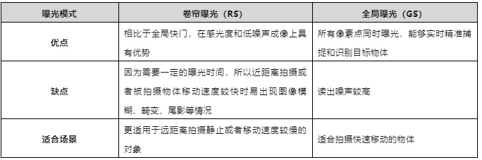 卷簾曝光(RS):在曝光開(kāi)始時(shí),感光組件會(huì)逐行或逐列進(jìn)行掃描并曝光,直至感光組件上所有像素點(diǎn)都完成曝光為止,但是每行或每列之間的曝光存在一定的時(shí)間差。