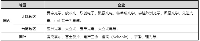 國(guó)內(nèi):舜宇光學(xué)、歐菲光、聯(lián)創(chuàng)電子、晶華光學(xué)、宇瞳光學(xué)、富蘭光學(xué)、藍(lán)思旺、瑞豐光電、中潤(rùn)光學(xué)、三景科技、瑞鼎光電、藍(lán)思光電、新旭光學(xué)、寧波峰梅等。