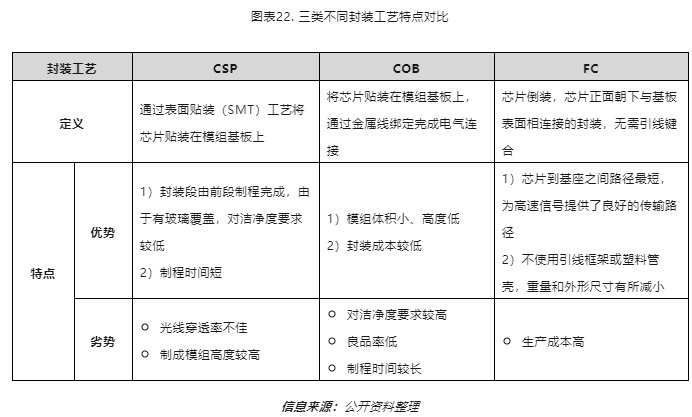 隨著車(chē)載攝像頭模組不斷地向高清化、小型化趨勢(shì)發(fā)展,車(chē)攝像頭模組封裝工藝也在逐步升級(jí)。目前,車(chē)載攝像頭模組還是以CSP封裝模式為主,即通過(guò)表面貼裝(SMT)工藝將芯片貼裝在模組基板上。綜合技術(shù)需求和成本因素的考量,對(duì)于5MP及以上的高分辨率攝像頭,車(chē)載攝像頭模組廠(chǎng)商會(huì)逐步采用通過(guò)金屬線(xiàn)綁定將芯片貼裝在模組基板上的COB封裝技術(shù)。