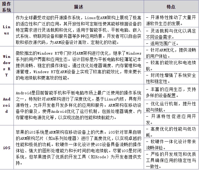 ARM架構(gòu)上常用的操作系統(tǒng)種類繁多,涵蓋從開源平臺(tái)到專有系統(tǒng),為基于ARM的設(shè)備提供了多樣化的軟件生態(tài)支持。以下是一些典型的操作系統(tǒng)及其在ARM架構(gòu)上的特點(diǎn)和應(yīng)用優(yōu)勢(shì)。