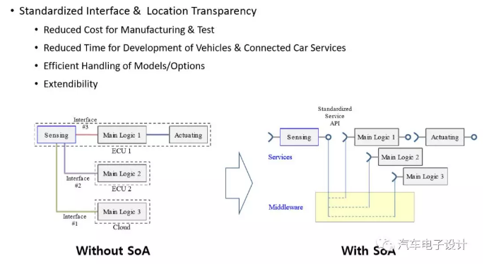 因此與傳統(tǒng)的在單片系統(tǒng)里面做的傳感、信號(hào)邏輯判斷執(zhí)行,在基于SOA系統(tǒng)里面在中間件里面但開(kāi)了,并且導(dǎo)入了標(biāo)準(zhǔn)的API。導(dǎo)入了中間件,服務(wù)提供者和服務(wù)使用者之間的連接是在運(yùn)行時(shí)建立的 ,和之前相比很多的功能在系統(tǒng)設(shè)計(jì)時(shí)建立完整的邏輯體系。