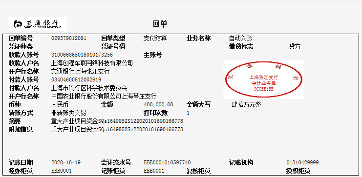 2020年8月,根據(jù)《閔行區(qū)關(guān)于推進科技創(chuàng)新創(chuàng)業(yè)和成果轉(zhuǎn)化的政策意見》(閔府規(guī)發(fā)〔2019〕1號)及操作細(xì)則,上海創(chuàng)程“基于5G技術(shù)的智能網(wǎng)聯(lián)公交系統(tǒng)”項目立項獲得成功,10月份,我司該項目已通過上海市閔行區(qū)科學(xué)技術(shù)委員會的驗收,并獲得50%項目經(jīng)費,共40萬元,另一半項目經(jīng)費預(yù)計明年撥付。