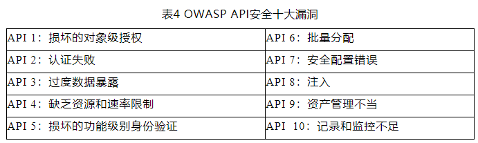 TSP是重要的車聯(lián)網(wǎng)云服務(wù),一般云服務(wù)存在的安全風(fēng)險,TSP同樣存在,可以參考OWASP Top 10。云端主要靠提供應(yīng)用程序編程接口(API)與其他端進行通信,API位于應(yīng)用程序之間或者充當(dāng)處理系統(tǒng)之間數(shù)據(jù)傳輸?shù)闹虚g層,它提供了一個簡單而高效的接口,用于擴展功能和改善聯(lián)網(wǎng)汽車體驗。API安全不是汽車網(wǎng)絡(luò)安全獨有的,更多API安全可以參考OWASP API安全十大漏洞,如表4所示。