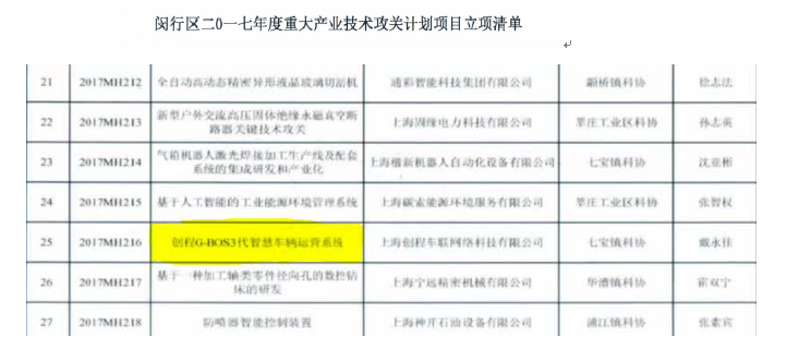 2017年11月8日,上海創(chuàng)程喜獲上海市閔行區(qū)科學技術委員會2017年重大產業(yè)技術攻關計劃項目資金支持。
