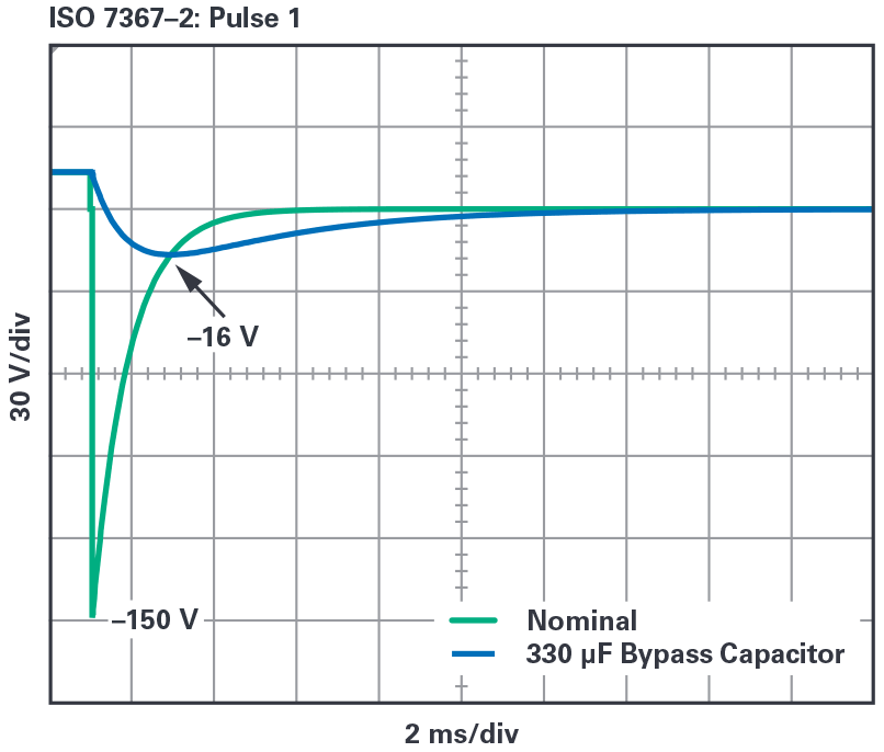 在最近的迭代中,ISO 7367-2電磁兼容規(guī)范主要介紹來自相對較高的阻抗源(2 Ω至50 Ω)的大幅度(>100 V)、短時持續(xù)(150 ns至2 ms)瞬變。這些電壓峰值通常可以使用無源組件消除。圖1顯示定義的ISO 7367-2脈沖1,以及增加的330 μF旁路電容。電容將尖峰幅度從–150 V降低至–16 V,完全在反向電池保護電路支持的范圍內(nèi)。ISO 7367-2脈沖2a、3a和3b的能耗遠低于脈沖1,所需的抑制電容也更少。