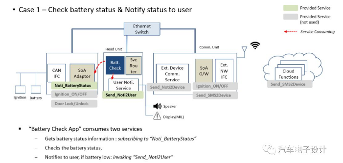 這里的核心價(jià)值,是把車?yán)锏男畔⑦€有動(dòng)作,有機(jī)和車主和維修人員相關(guān)的進(jìn)行連接,把車輛的軟件從單一的ECU里面解放出來(lái),形成一組抽象服務(wù)的程序。也就是說(shuō),我們?cè)谝韵碌臋z查高壓電池、檢查低壓電池上面,可以脫離原有的程序設(shè)計(jì),擴(kuò)展出頂端和服務(wù)器層面花樣更多的東西,由于邏輯方面在中間件里面進(jìn)行,這個(gè)想象空間和落地的用處就大了。