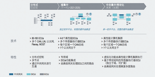 2015年,博世提出了眾所周知的電子電氣架構(gòu)技術(shù)路線圖, 并描繪了未來(lái)電子架構(gòu)的主要特征及可能的實(shí)現(xiàn)時(shí)間點(diǎn)。對(duì)于這一路線圖本身無(wú)需再做過(guò)多介紹,但其中的兩個(gè)重要標(biāo)志性節(jié)點(diǎn)依然值得強(qiáng)調(diào),即DCU或HPC的出現(xiàn),以及統(tǒng)一的基礎(chǔ)軟件平臺(tái)的出現(xiàn),標(biāo)志著EEA的本質(zhì)進(jìn)化。盡管由于車企的解決方案各不相同,其對(duì)EEA進(jìn)化的階段定義可能有所不同,但羅蘭貝格認(rèn)為EEA的發(fā)展整體會(huì)經(jīng)歷三大階段:分布式架構(gòu)、基于域的集中式架構(gòu)和基于域融合的帶狀架構(gòu),如圖4。