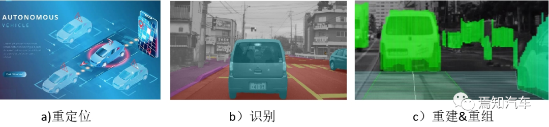 “場景重建”意味著從視頻序列推斷場景中的幾何體,包括車輛在場景中的位置?!耙刈R(shí)別”是一個(gè)術(shù)語,用于將語義標(biāo)簽附加到視頻圖像或場景的各個(gè)識(shí)別對(duì)象中,識(shí)別中包括各種不同的層次結(jié)構(gòu)?!白攒囍匦露ㄎ弧笔侵杠囕v相對(duì)于其周圍環(huán)境的位置識(shí)別和度量定位?!瓣P(guān)鍵目標(biāo)重組”是將重定位、識(shí)別、重建形成的三個(gè)組成部分信息重新整合成統(tǒng)一表示的方法。