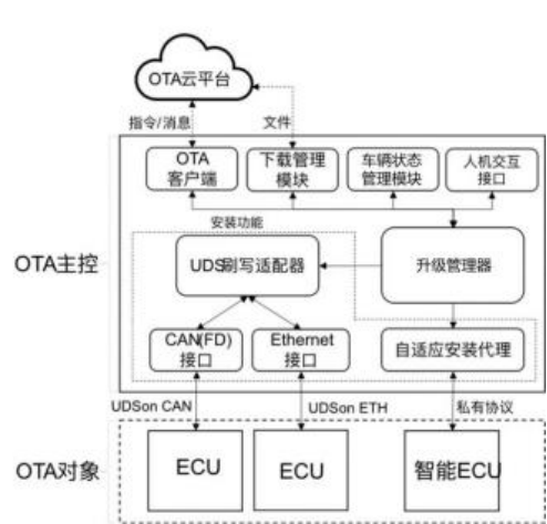 ② 車輛控制:對于影響車輛安全的升級,整個升級過程需要保持在一種安全狀態(tài),因此, OTA 主控需要具備一定車輛功能控制能力,根據(jù)不同的升級類型,控制車輛的功能狀態(tài)。