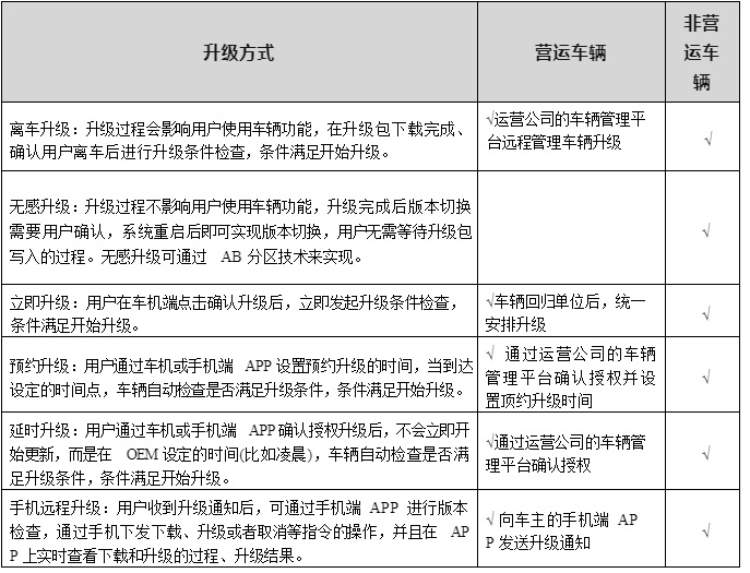 基于實際業(yè)務要求,各家 OEM 的 OTA 人機交互方式各有差異,本節(jié)共總結(jié) 6 種主流升級方式,并針對營運車輛與非營運車輛使用性質(zhì)不同,分別展開分析,具體如表 2-10 所示。